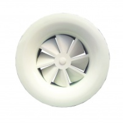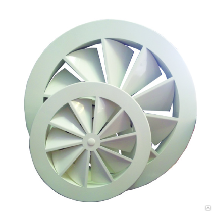 Внешняя панель диффузора включает в себя круглую панель со встроенным соплом, лопатки для воздухораздачи (регулируемые или неподвижные), закрывающие центр декоративного колпачка и соединительный патру..