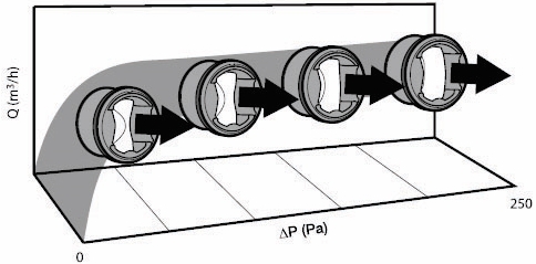 ● Задачей клапана AIRFIX является постоянный контроль расхода воздуха в системе вентиляции. ● Клапан AIRFIX может быть легко установлен в круглых воздуховодах, чтобы контролировать точный и постоянный расход воздуха с большим диапазоном диффенциального давления. ● Мембрана надувается или сдувается в зависимости от падения давления с обеих сторон клапана AIRFIX, контролируя посто- янный расход воздуха (см. иллюстрацию ниже). ● Этот принцип гарантирует постоянный расход воздуха, когда изменяется дифференциальное давление.